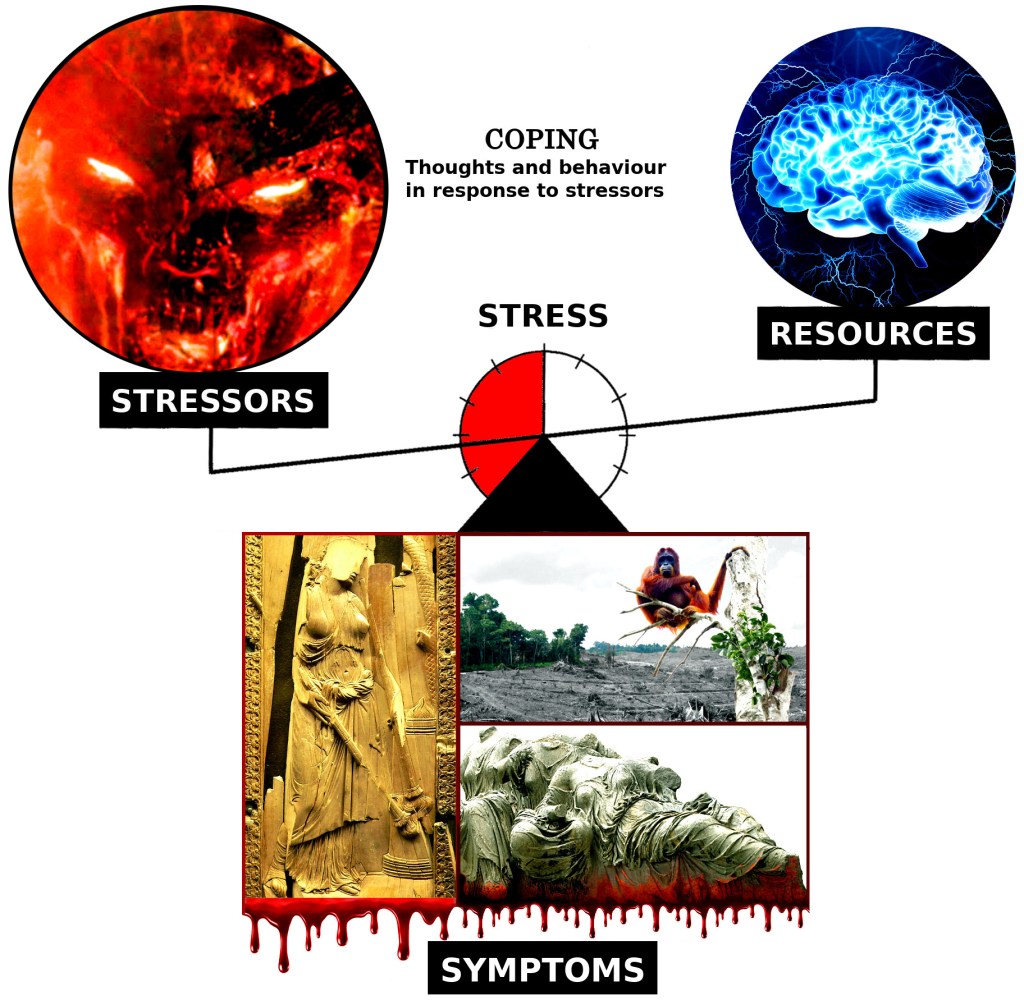 - Outcomes, e.g. stress, stress-related symptoms, illness / death, mass human die-off, including from the Jew attacks. Stress occurs when the demands of stressors tax or exceed coping resources.